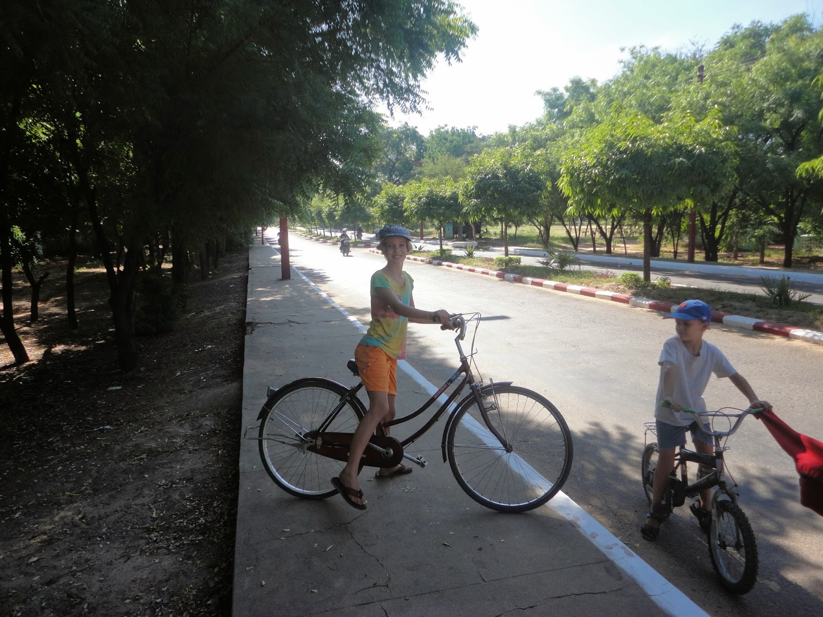 | It was our first time on bikes since May. BR's bike quit on us half-way through so we rigged up this system so he could coast behind his dad. Amazingly, it actually worked somehow. |
